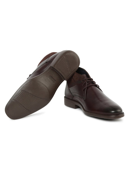 The Chukka Boot shoe is finished with smooth calf leather combined with a suede ankle quarter piece, suede. Tonal contour stitching and embossed logo on the tongue give finesse to this all-season semi-formal shoe.