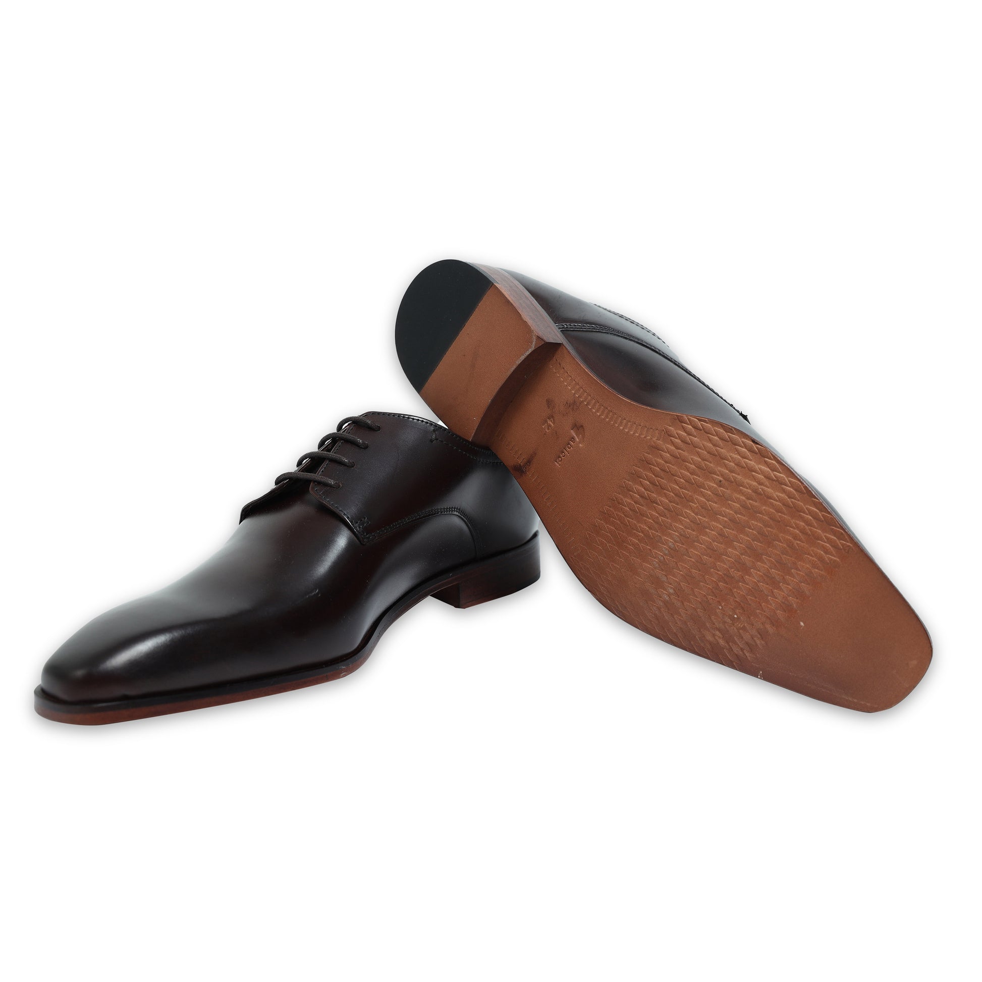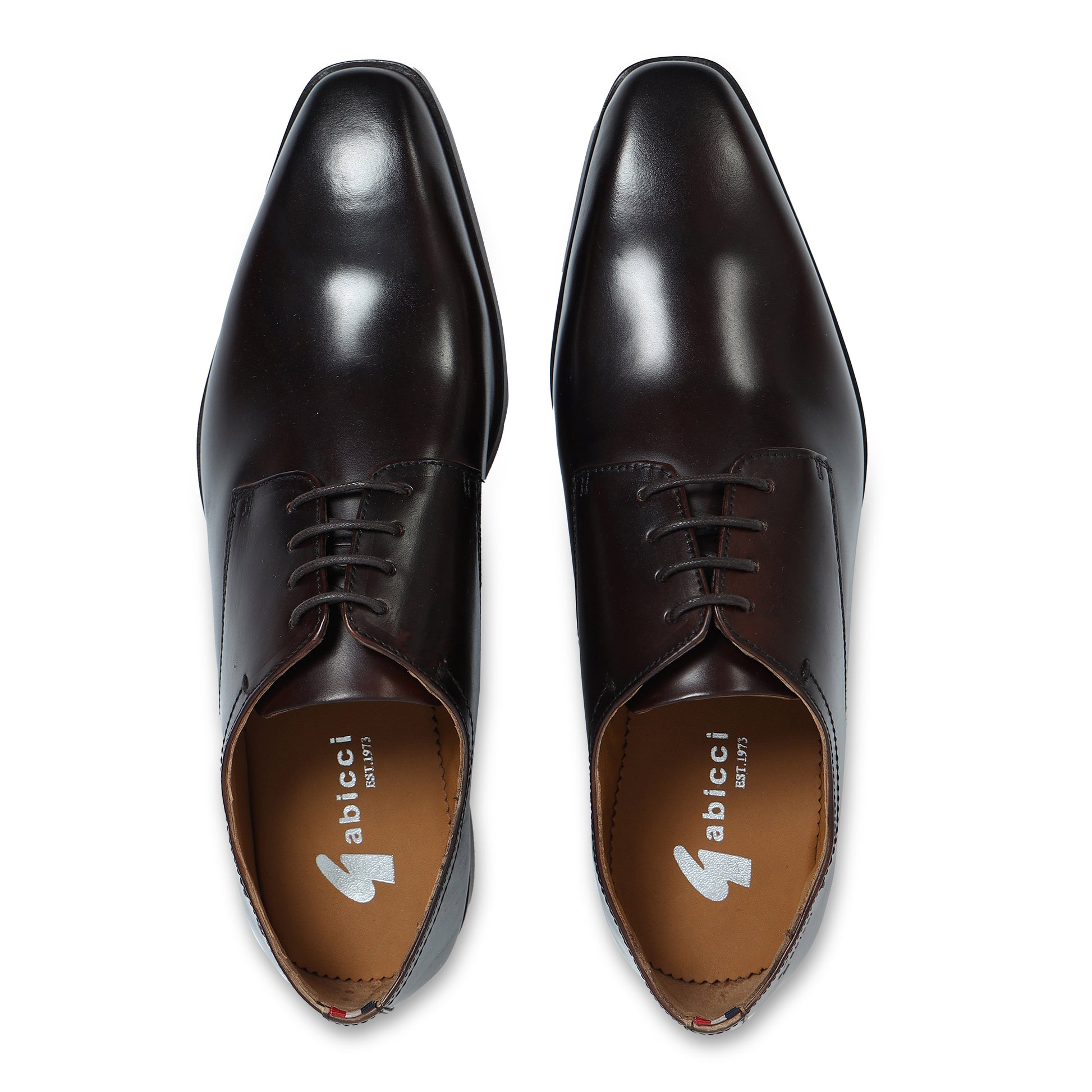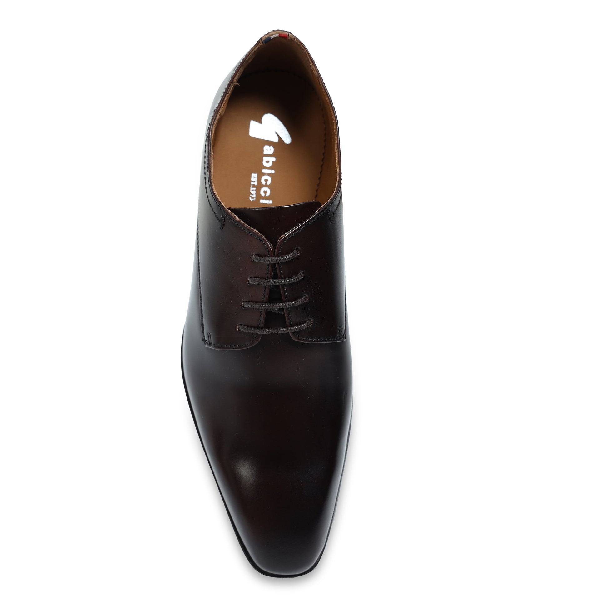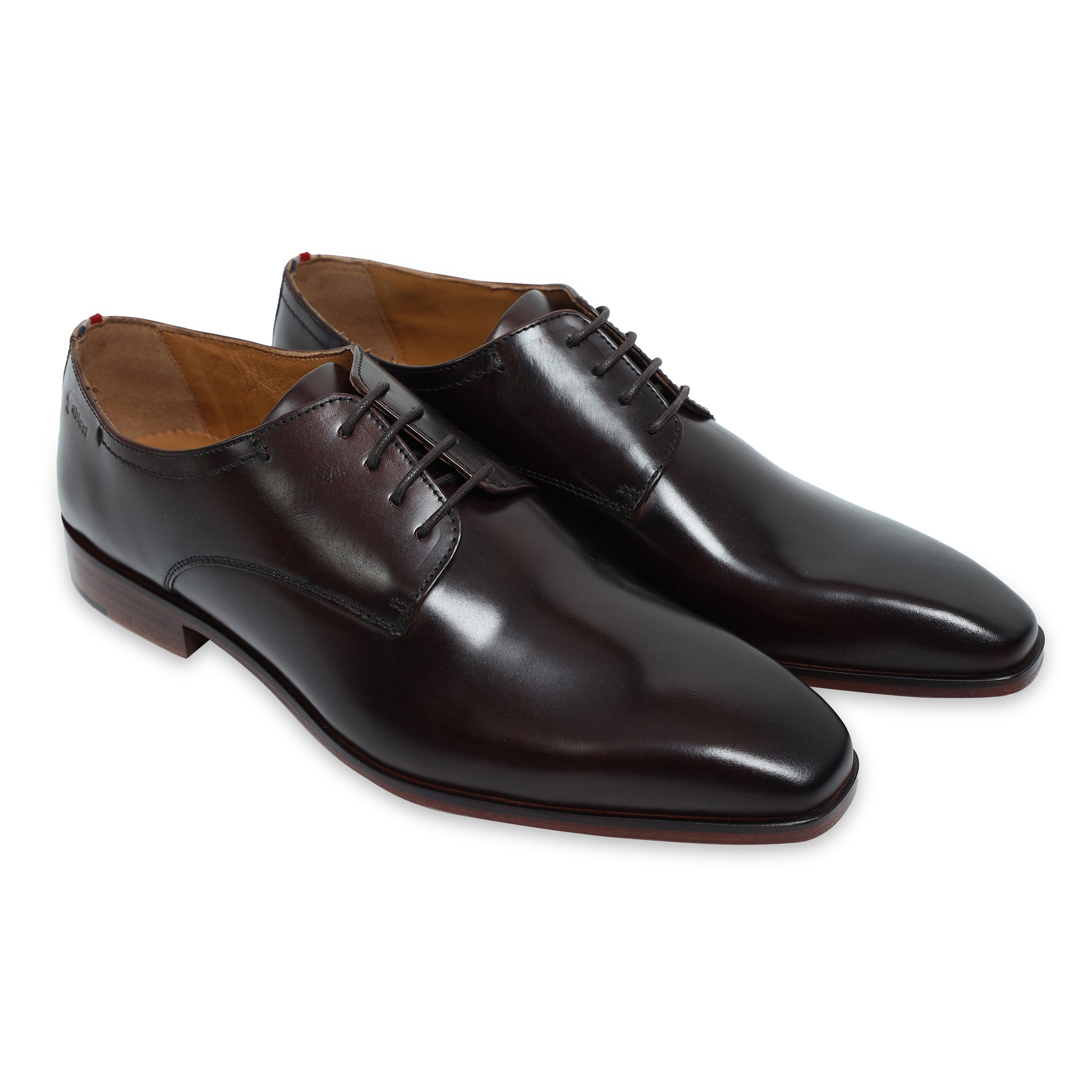 Elevate your formal attire with these sophisticated brown Derby shoes. Designed for the modern gentleman, they feature a sleek, plain toe with a stylish burnished (darkened) tip that adds depth and character to the finish. The open lacing system provides a comfortable, adjustable fit, making them ideal for all-day wear at the office, weddings, or business events. A subtle tri-color accent tag on the collar adds a unique, contemporary touch to this timeless silhouette.