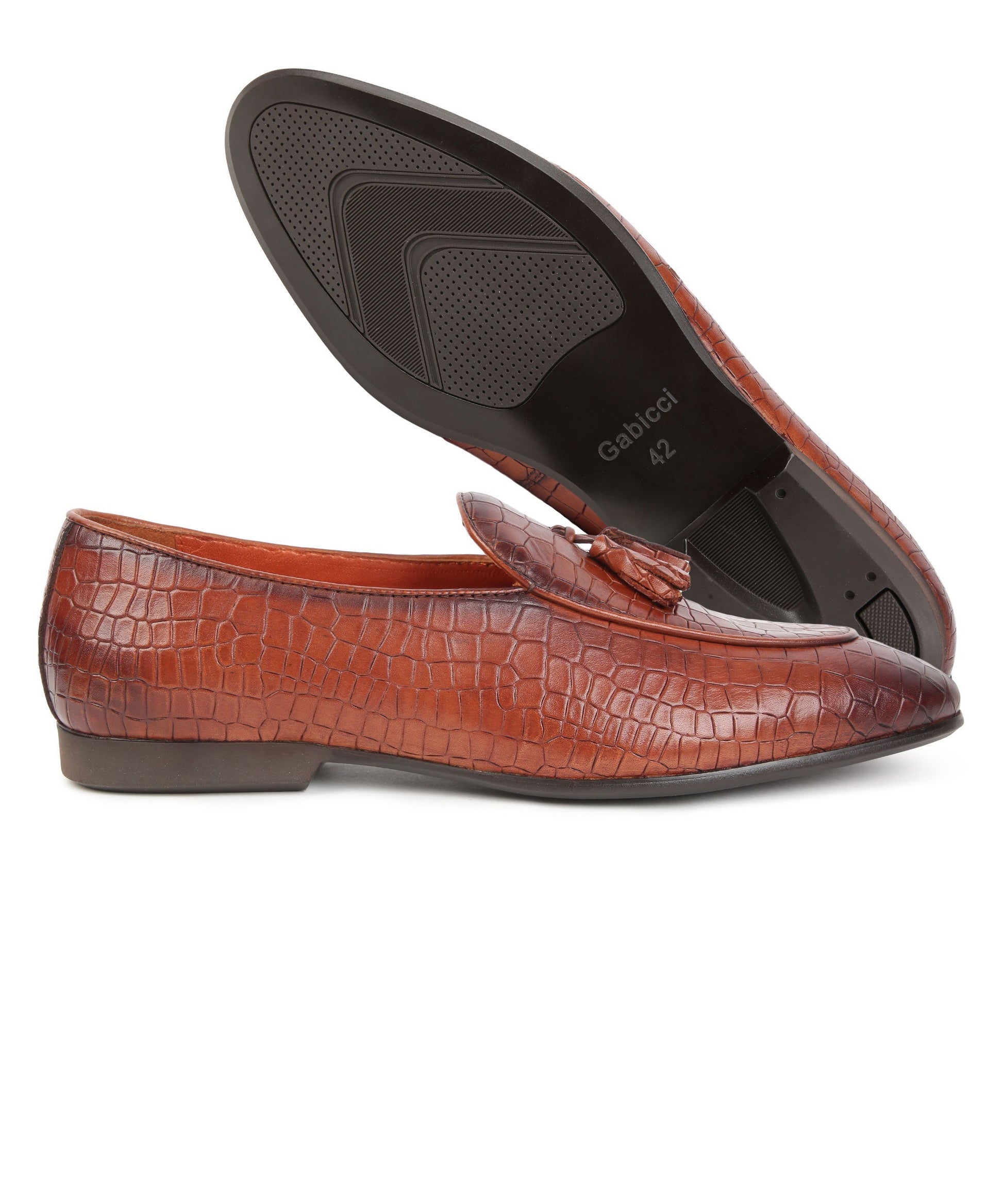 Introducing the Oak Land Alligator Print Handcrafted Slip-On from Gabicci, a luxurious addition to any discerning wardrobe. These exquisite slip-ons are meticulously handcrafted, featuring a striking alligator print that exudes sophistication and style. The tassel embellishment adds a touch of elegance, making these shoes a perfect choice for those who appreciate fine details. The premium TPR (thermoplastic rubber) sole ensures exceptional comfort and durability, allowing for effortless wear throughout the day.